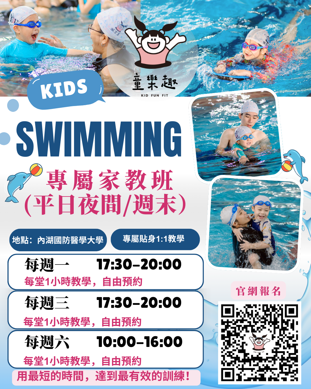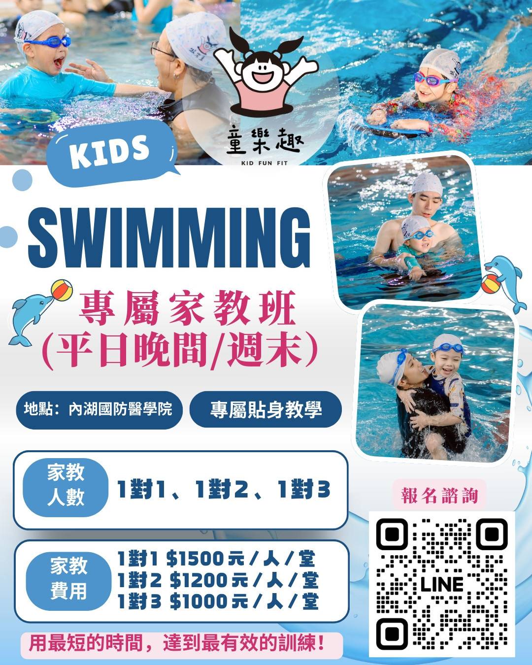 若有其他需求歡迎洽詢官方LINE @kidfunfit2018,直接客製化您的課程,安排專屬的家教游泳課