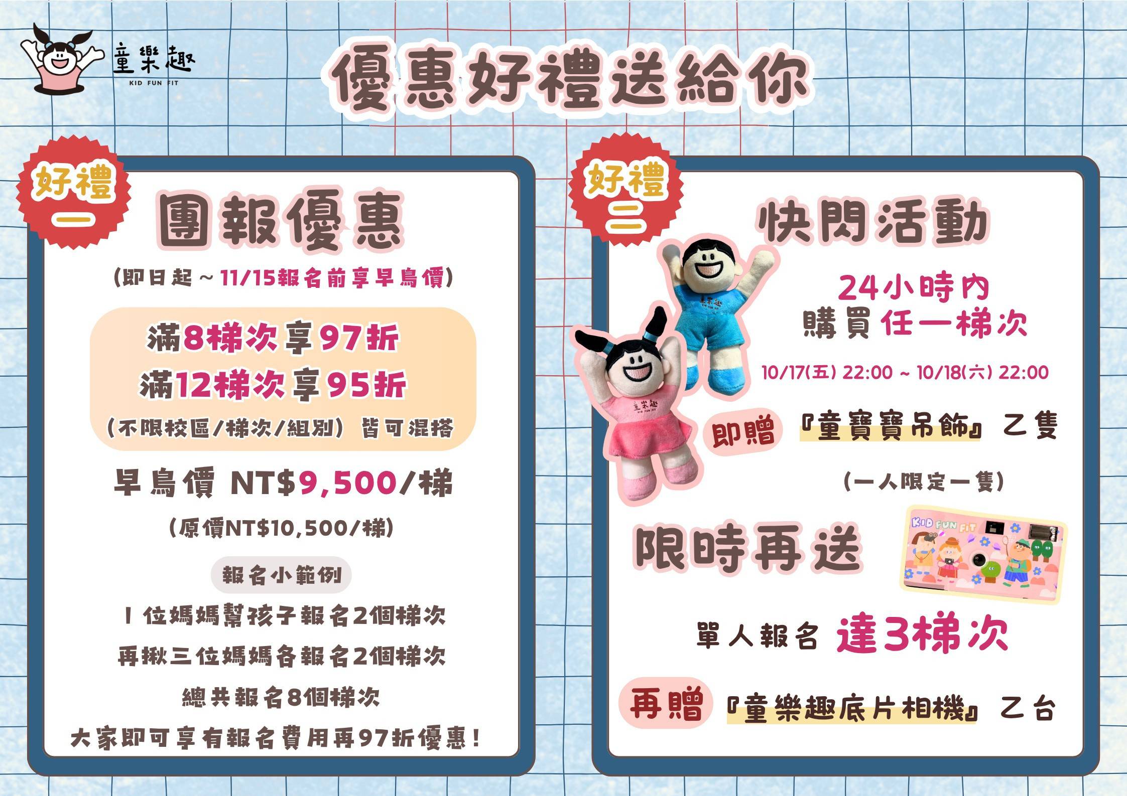24小時快閃活動✨ 1️⃣10/17(五)22:00-10/18(六)22:00間報名,任一梯次即贈童寶寶娃娃乙隻(一人限定一隻) 2️⃣單人報名達3梯次再贈童樂趣底片相機乙台